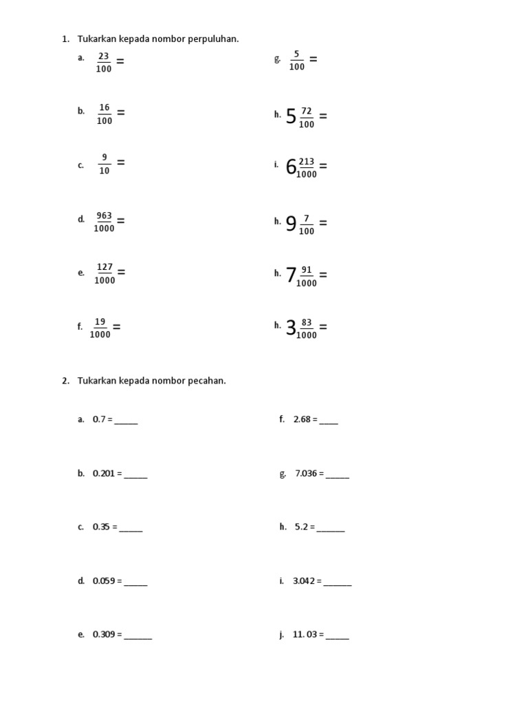 Ejercicio De Menukar Perpuluhan Kepada Pecahan